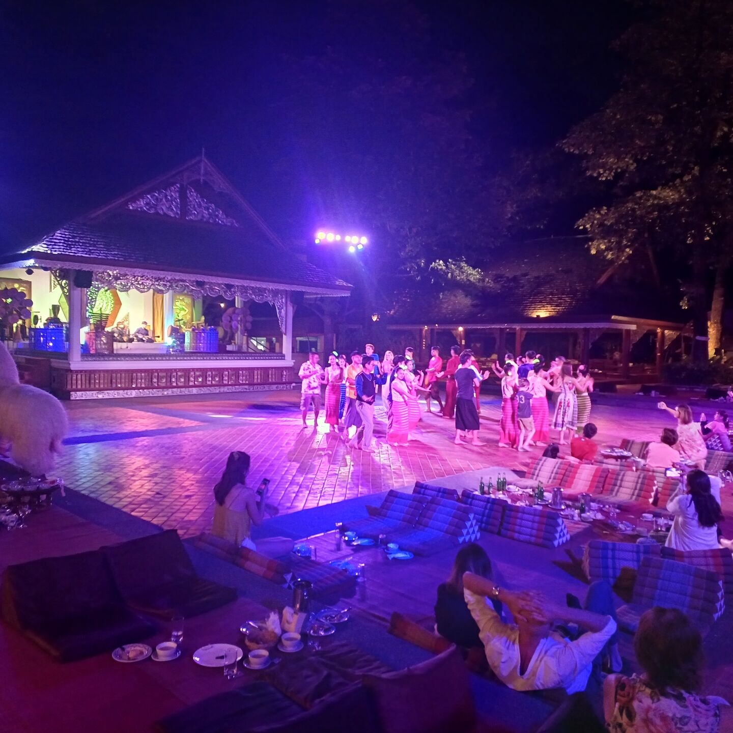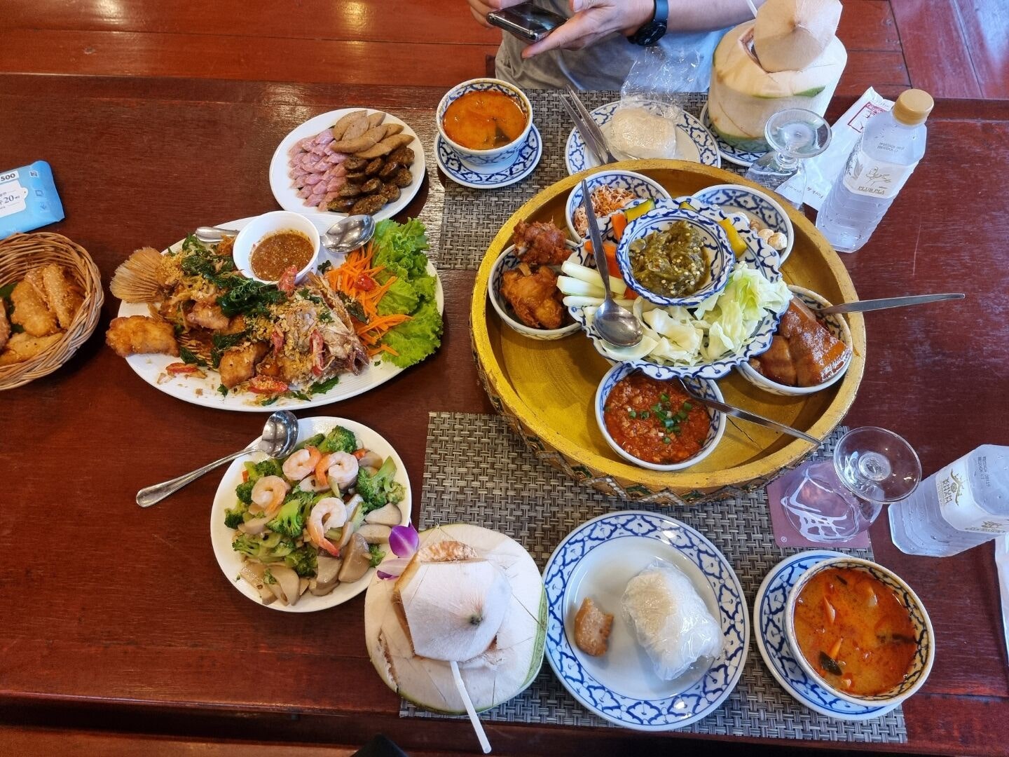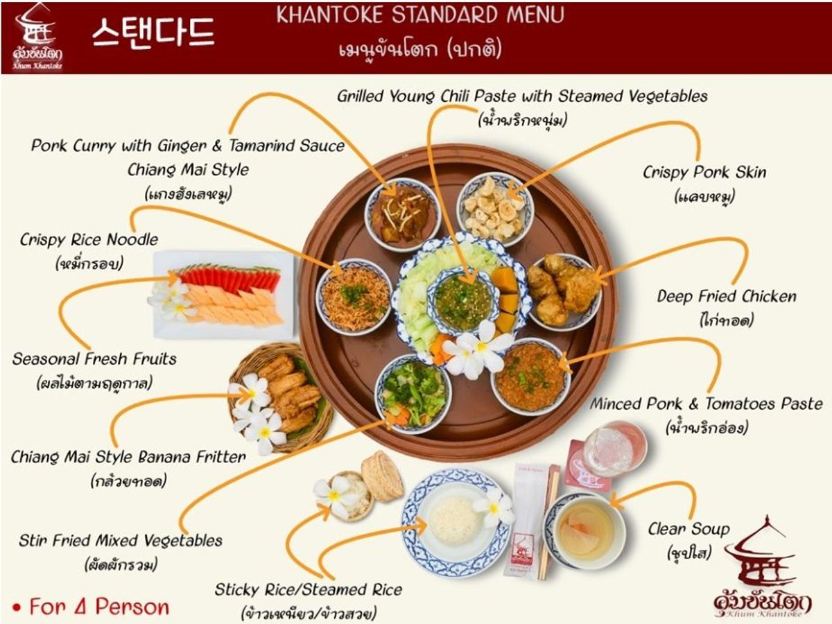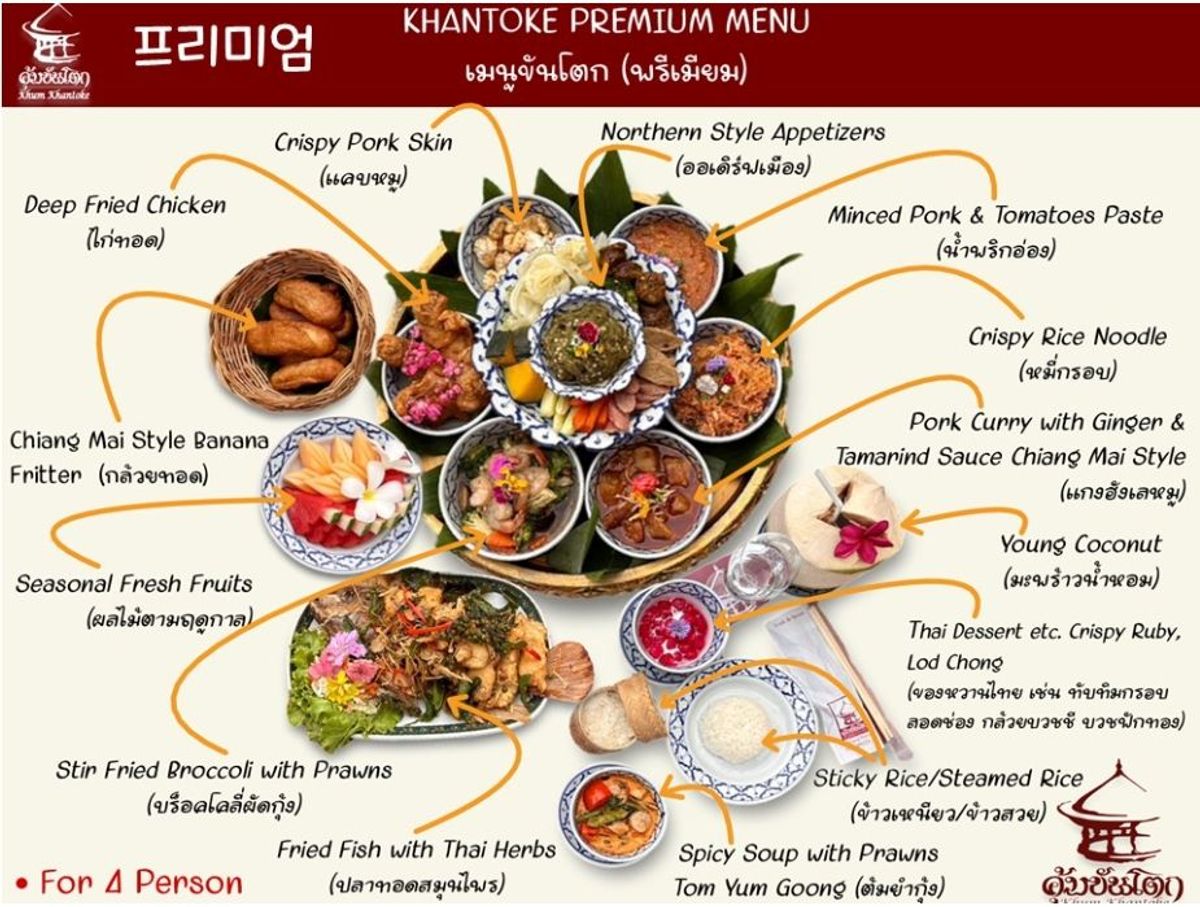 태국 전통 식사 방법인 바닥에 앉아 낮은 테이블에서 먹는 방식으로 큰 접시에 담겨 나오는 풍성한 가정식이며,