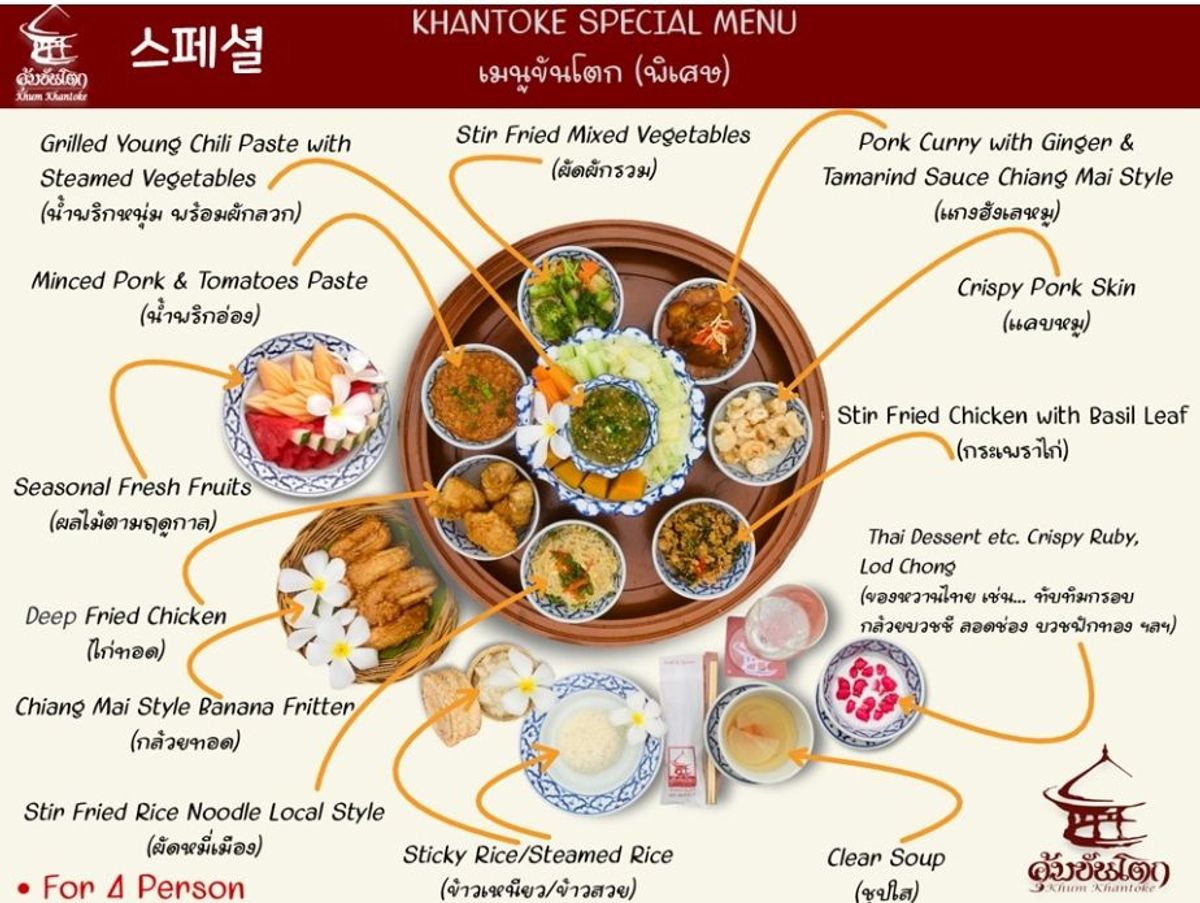 "칸톡" 이라 불리우는 란나 스타일의 전통 밥상에 밥과 갖가지 반찬이 나오며,